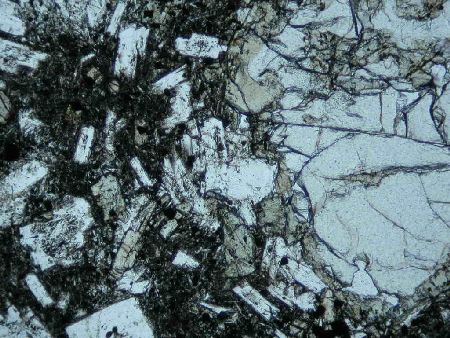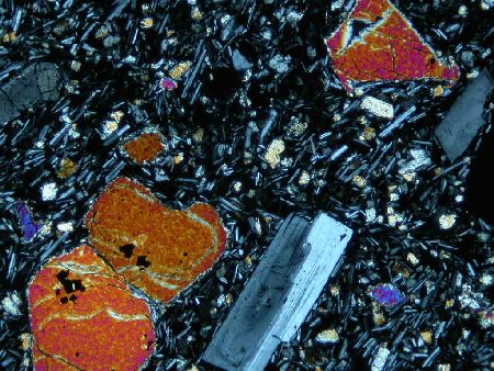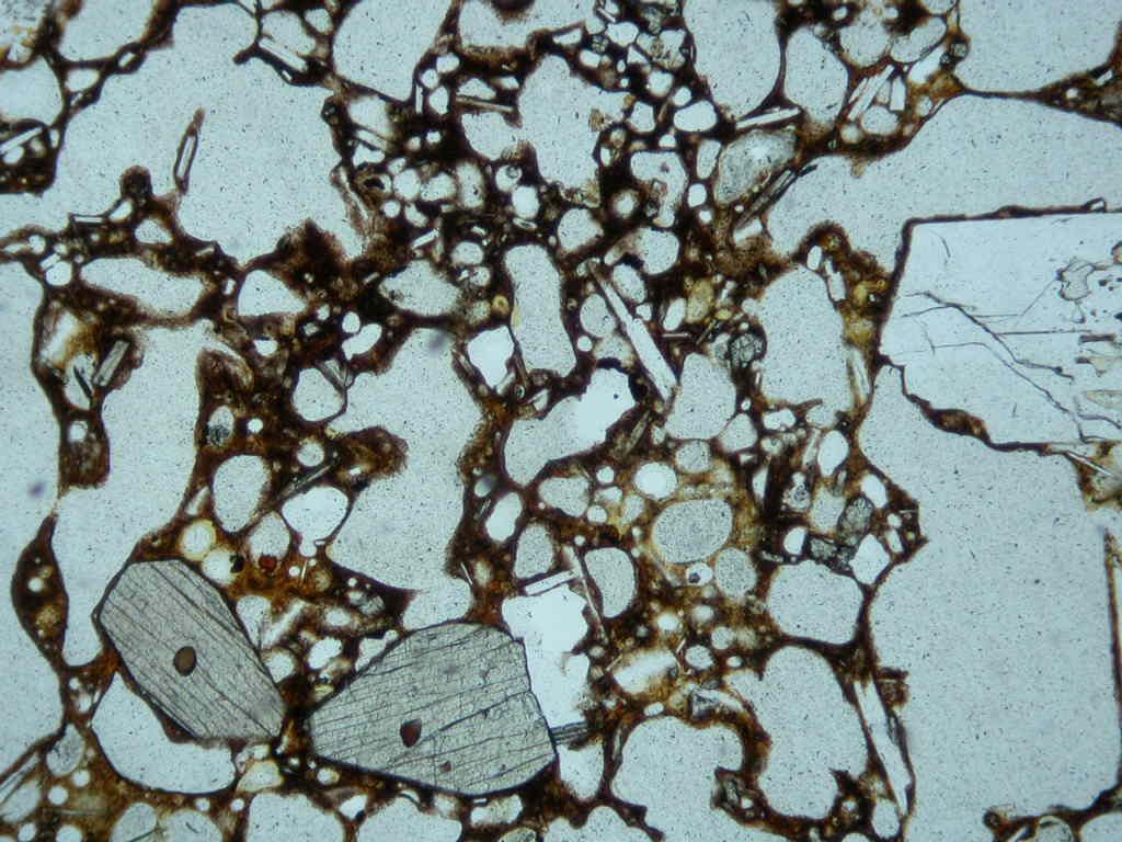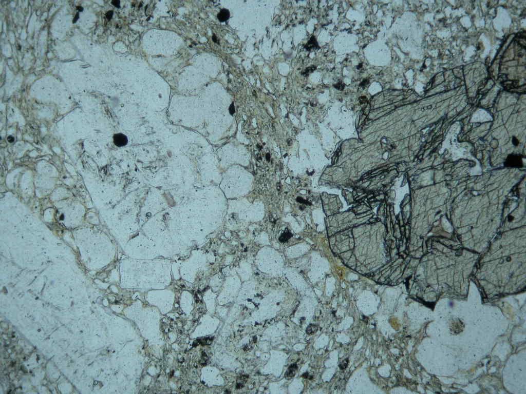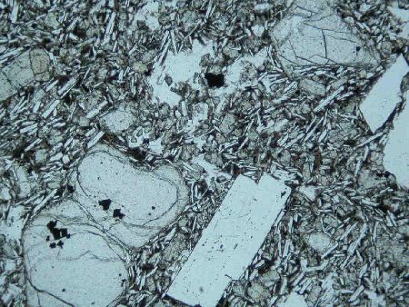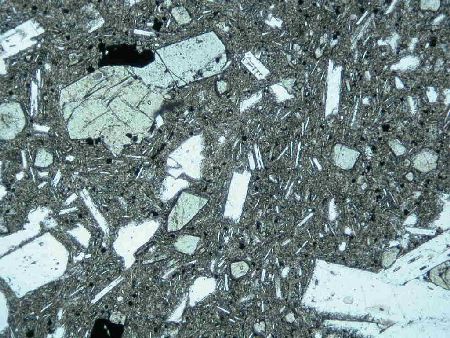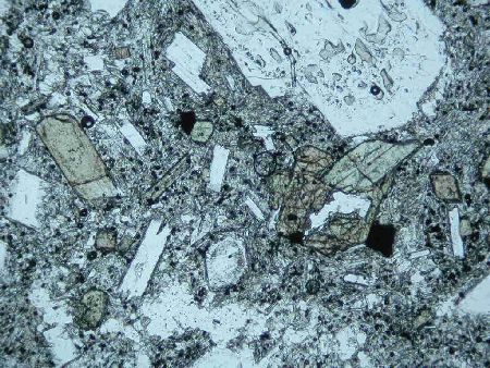 高堂森火山から10万年以上前に流出した湯向溶岩.含かんらん石輝石安山岩.かんらん石斑晶(右半分の大きな斑晶.輝石の反応縁で囲まれている)が含まれる.